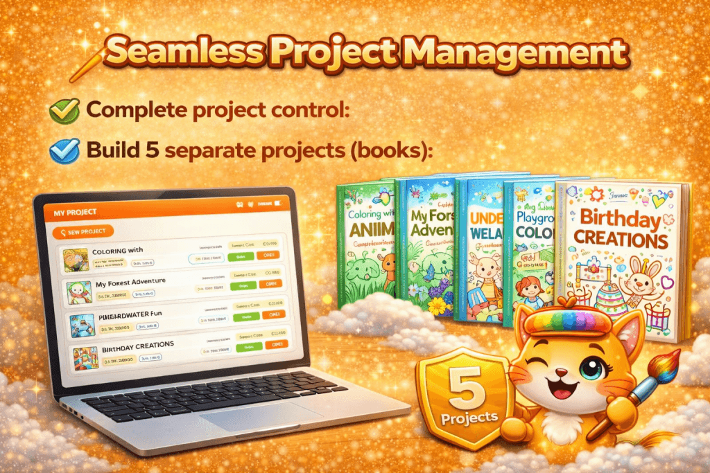 Let the AI do the heavy lifting. Use the 4 Variations mode to instantly pump out beautiful Color By Line pages. Preview them using the high-def Lightbox, then drag, drop, and reorder your pages easily in the Project Management tab.