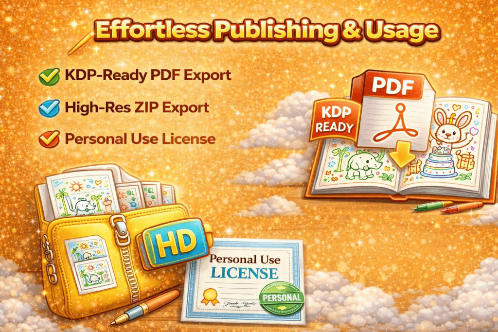 Yes, definitely! When you purchase today, you get full commercial rights for all the publications you export. You can confidently upload your 8.5×8.5″ PDFs to Amazon KDP, sell 300 DPI ZIP bundles on Etsy, or print them locally. You keep 100% of the profits!