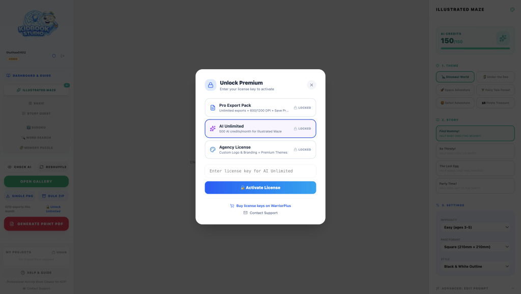 You have successfully upgraded to KidBook Studio AI Premium. Your AI generation limits have been supercharged, and you are now ready to create stunning, full-color illustrated mazes with 500 monthly credits and VIP priority speed.